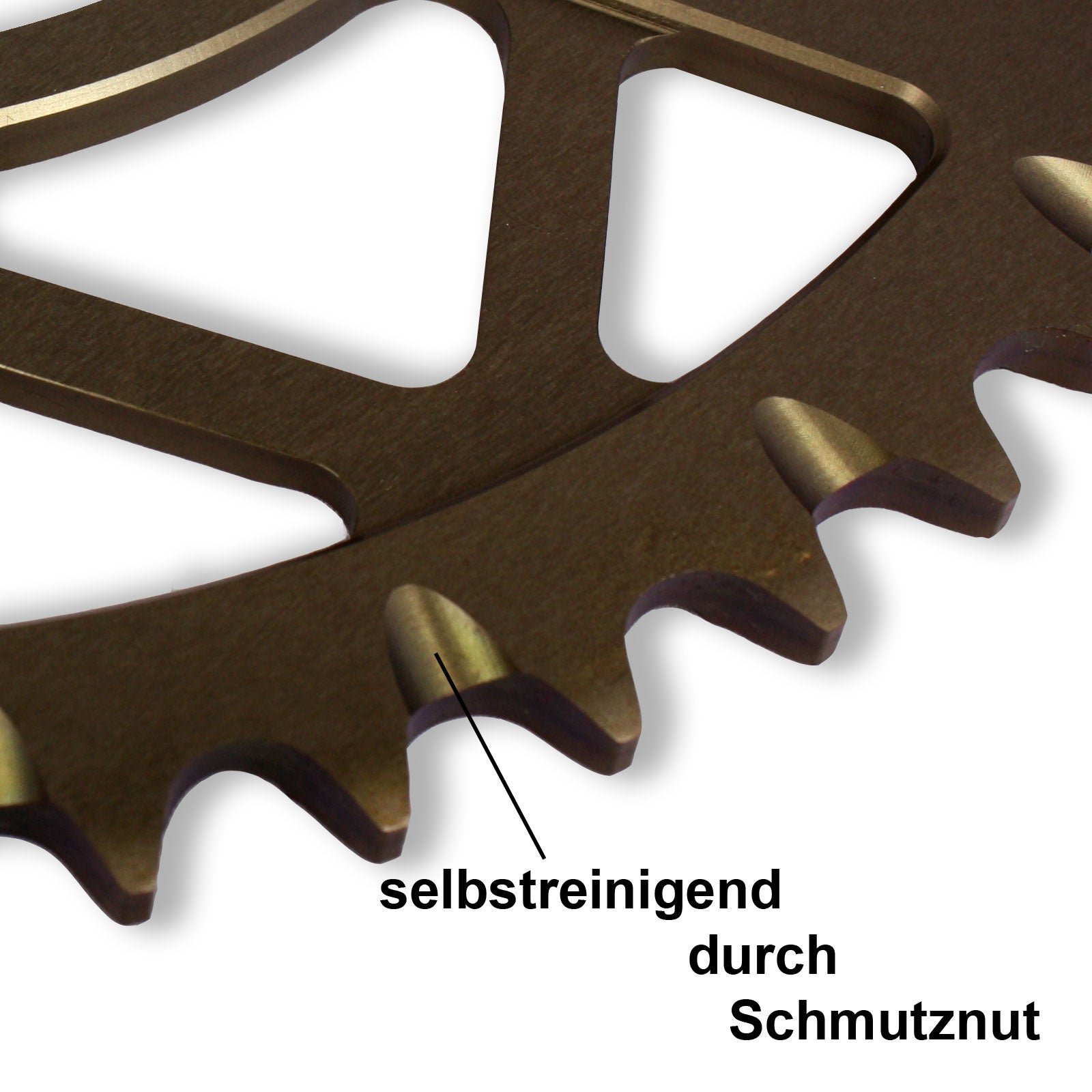 Schlamm und Schmutz werden durch eine Nut auf der Unterseite des Zahnes herausgedrückt und können sich so nicht mehr zwischen Kettenrad und Kette absetzen. Eine zusätzliche Spannung der Kette und der damit einhergehende Verschleiß von Kettenrad und Kette werden so vermieden.